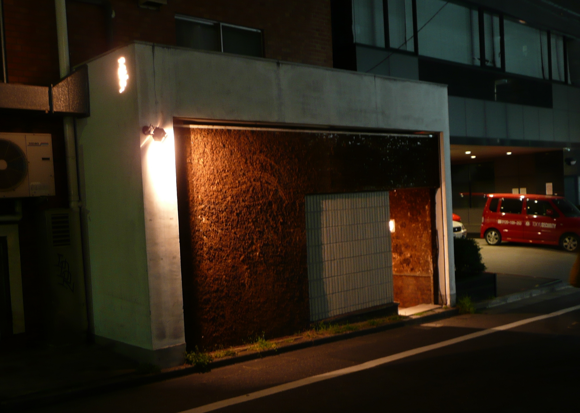 You would never notice it.  The sign (in Japanese only) is the small patch of light on the upper left side of the lava stone facade.  Other than that, there’s no indication what the building is.