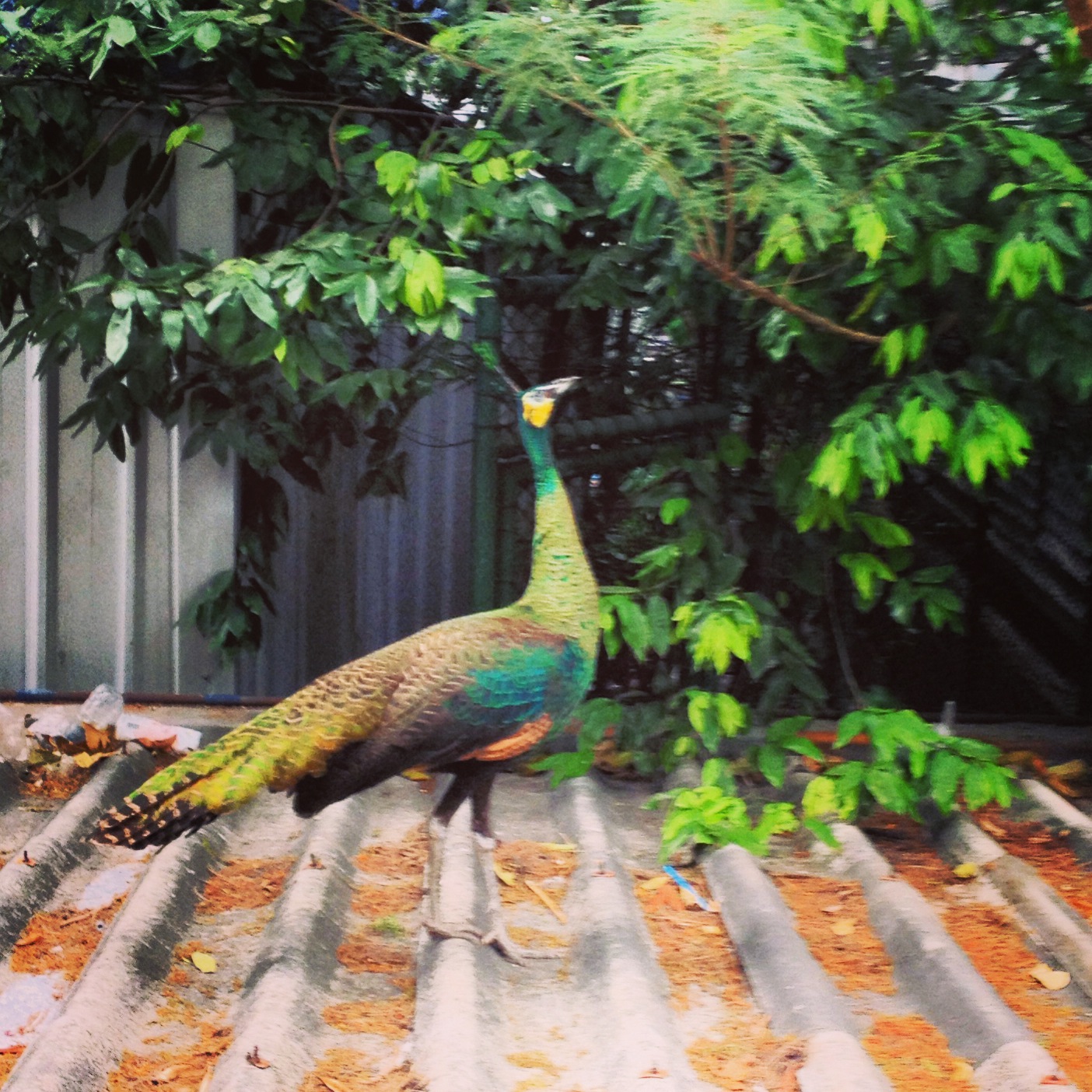Approaching slowly so as not to startle it, I discovered that there was a corrugated roof covering the parking spaces on the ground floor. Strutting on this roof, pecking at the debris that had fallen from the adjacent trees, was this beautiful peacock.