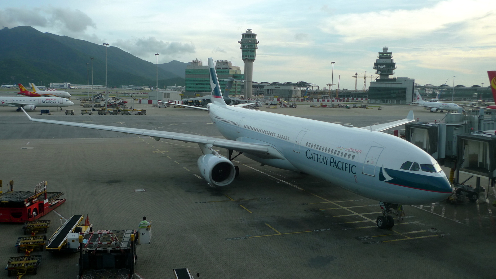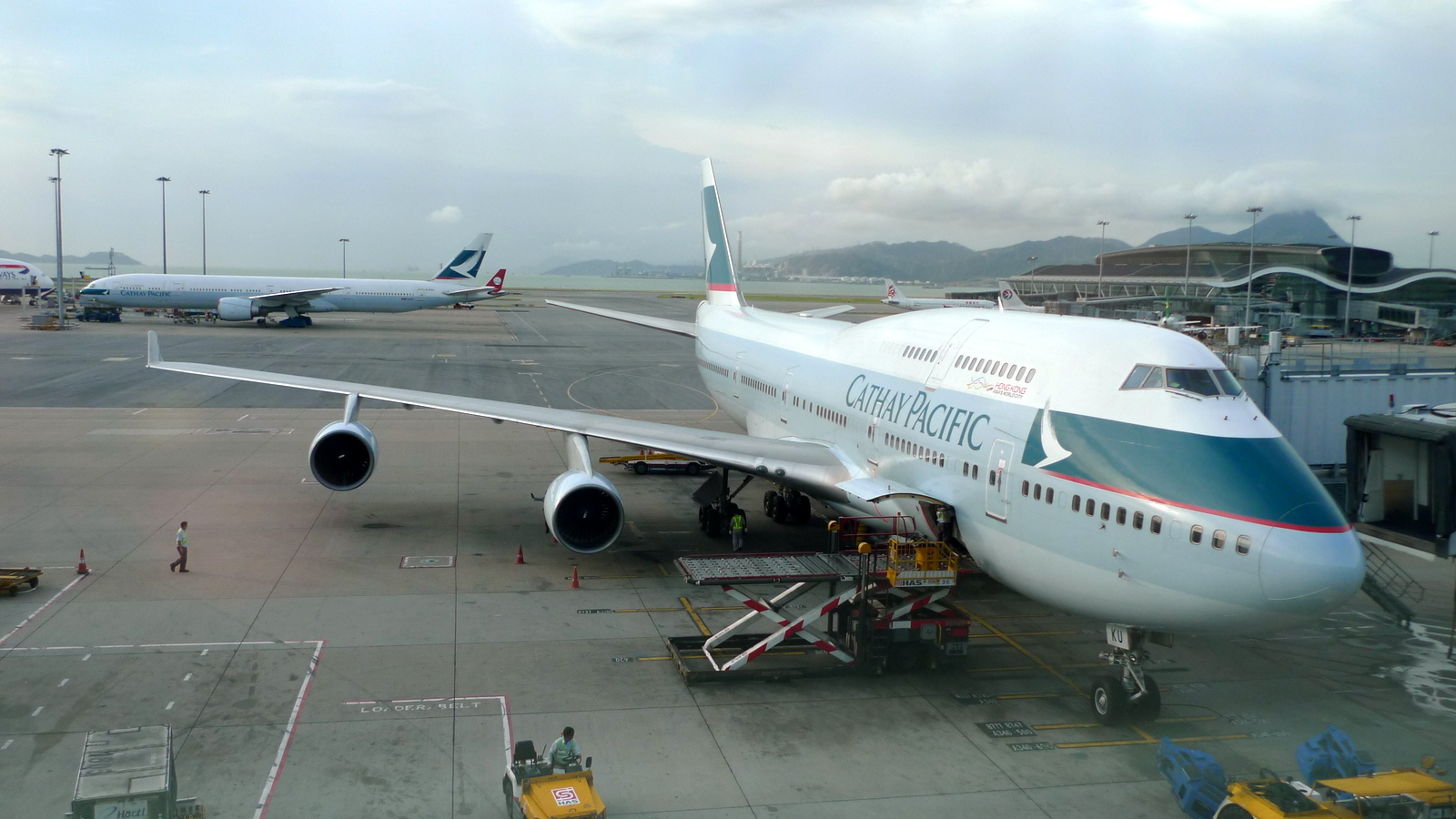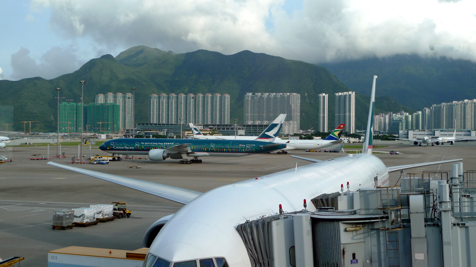 Cathay Pacific Boeing 777-300 – the terminal in the background handles flights to/from the Mainland