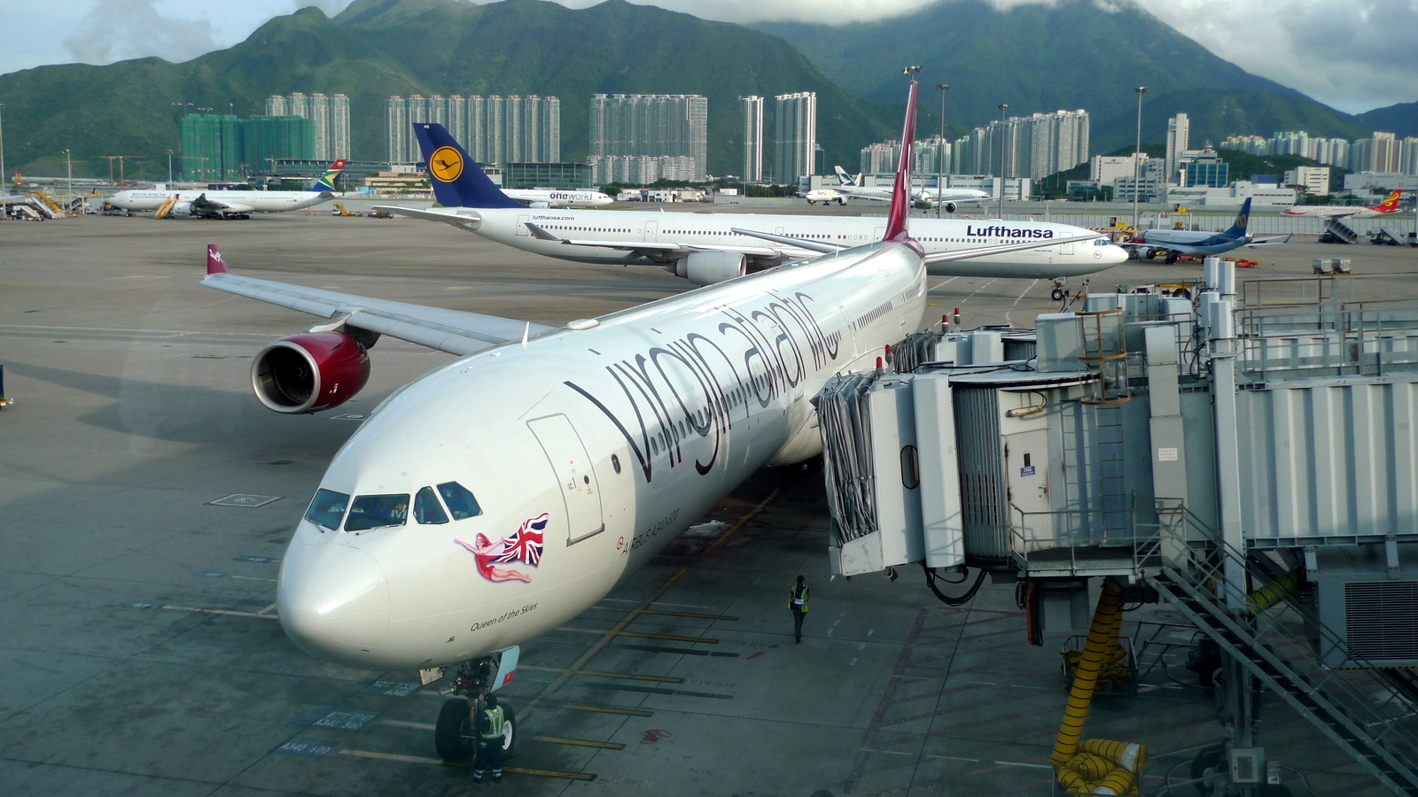 A pair of Airbus A340-600s, the front one belonging to Virgin Atlantic and the back one from Lufthansa.