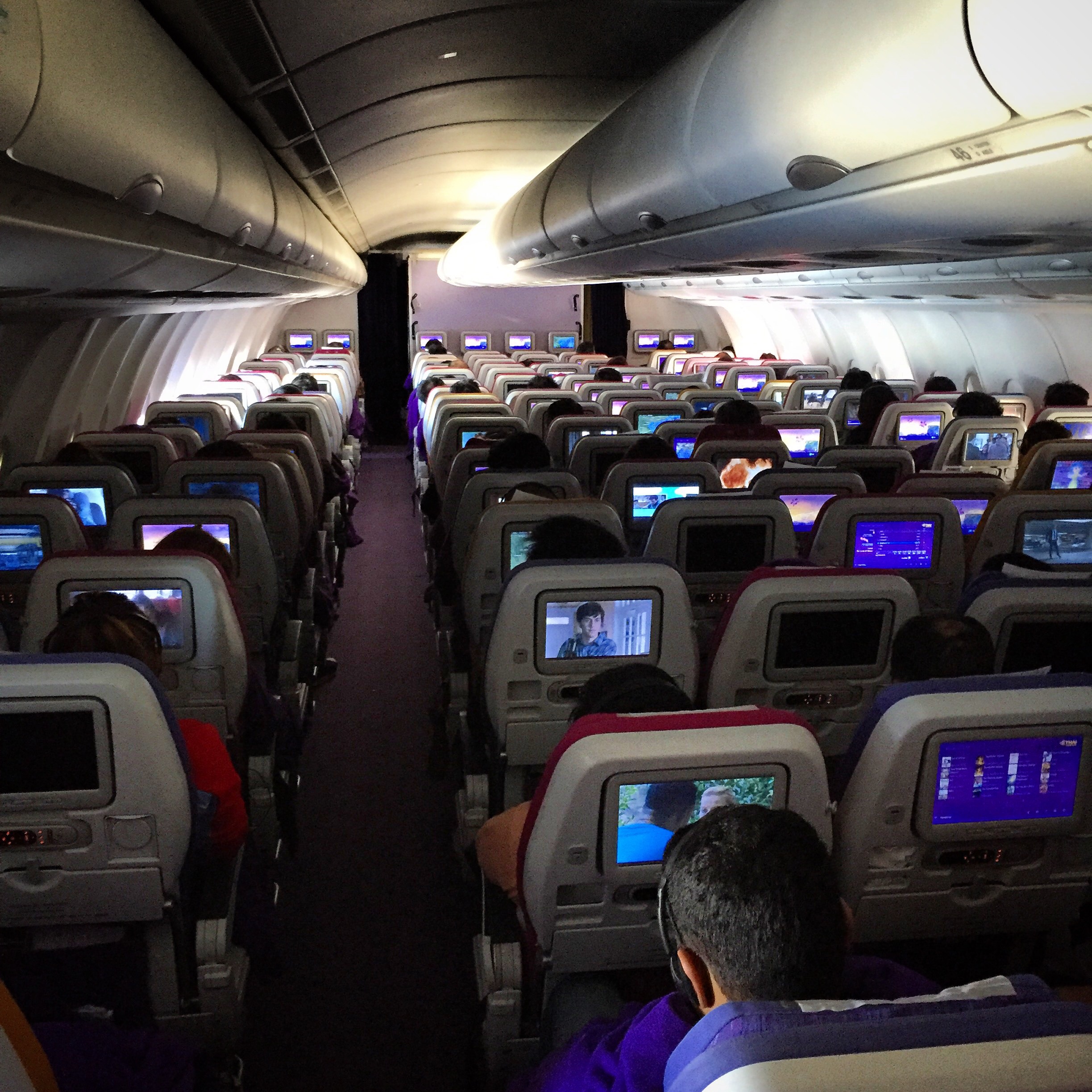 Heading towards the back of the plane on the main deck are two massive Economy Class cabins. Each has 17.5-inch seats in a 10-abreast configuration. Each seat has its own touchscreen monitor with loads of free entertainment.