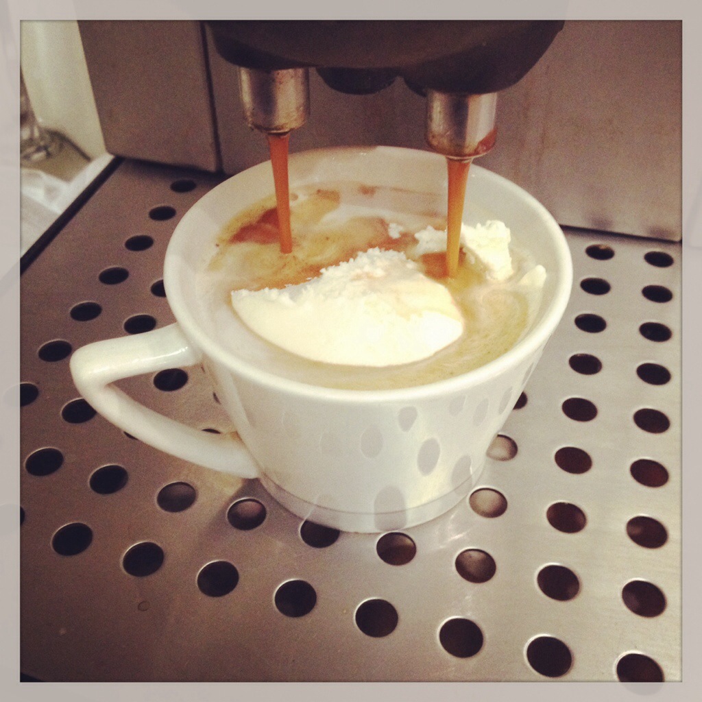 We followed a similar preparation, cooking a very nice grass-fed filet mignon in the sous vide until rare and then slicing it into medallions. The benefit of sous vide is that by cooking the food in a vacuum-sealed bag immersed in a water bath, the entire piece of food reaches exactly the desired temperature and then cooks no further. Instead of the outside of the steak being cooked and the inside being raw, as might happen when you fry or roast a steak, the entire cut was a consistent 131 degrees Fahrenheit and still a pretty pink.