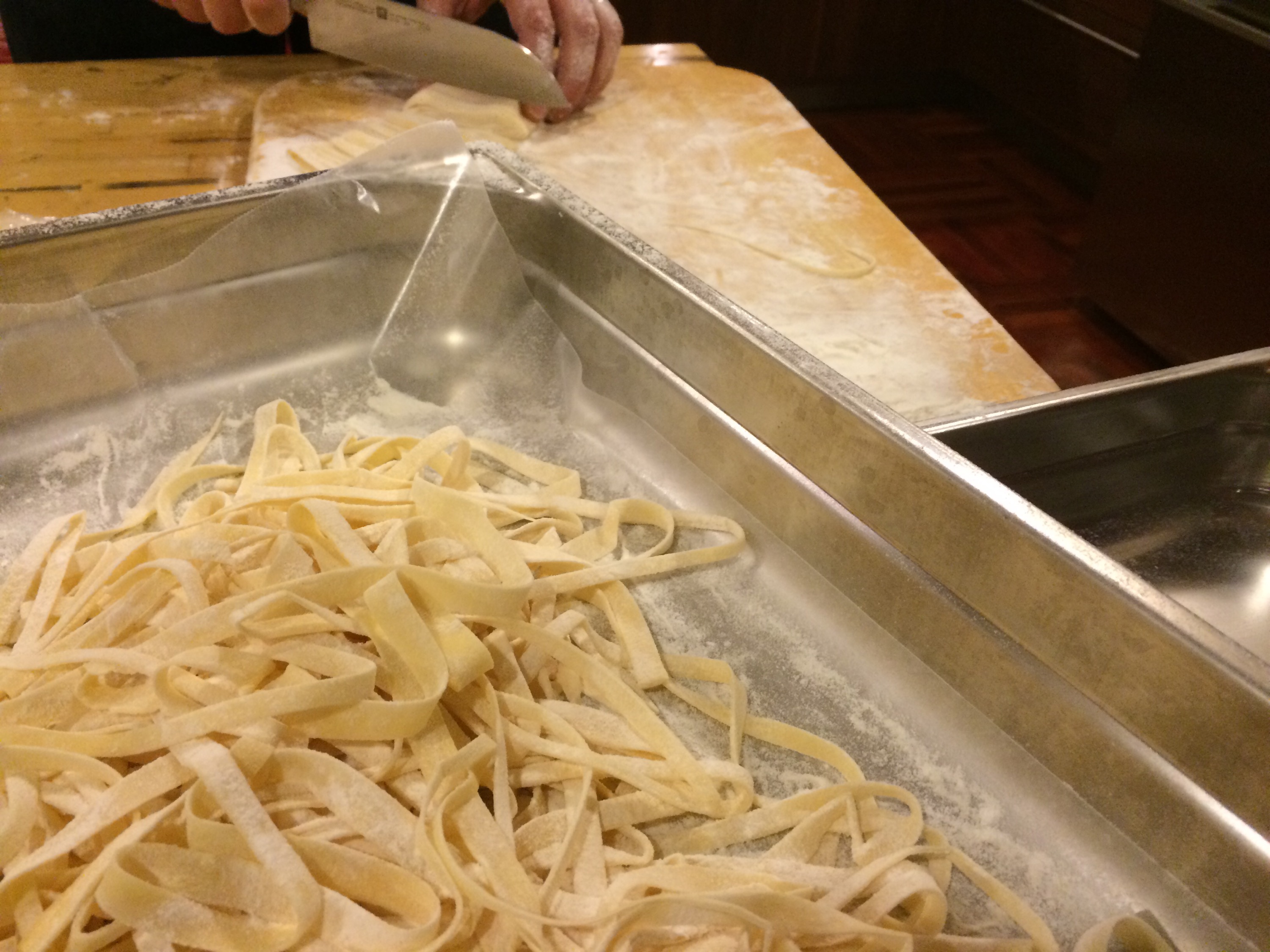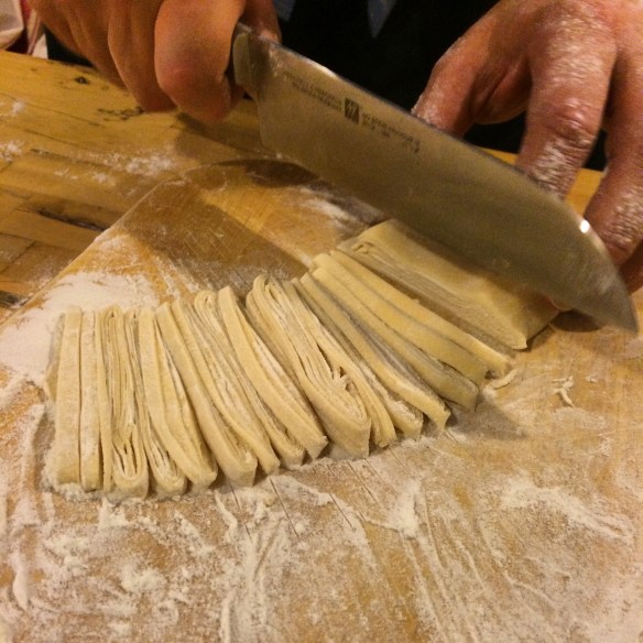 As the meat cooked, about two-and-a-half hours, we skinned whole chickens, basically turning them inside out. This was an interesting experience, something I have never done before. The end result are these sheets of chicken skin (seen layered in plastic wrap, above) with little “fingers” of skin like a glove where the legs were.
