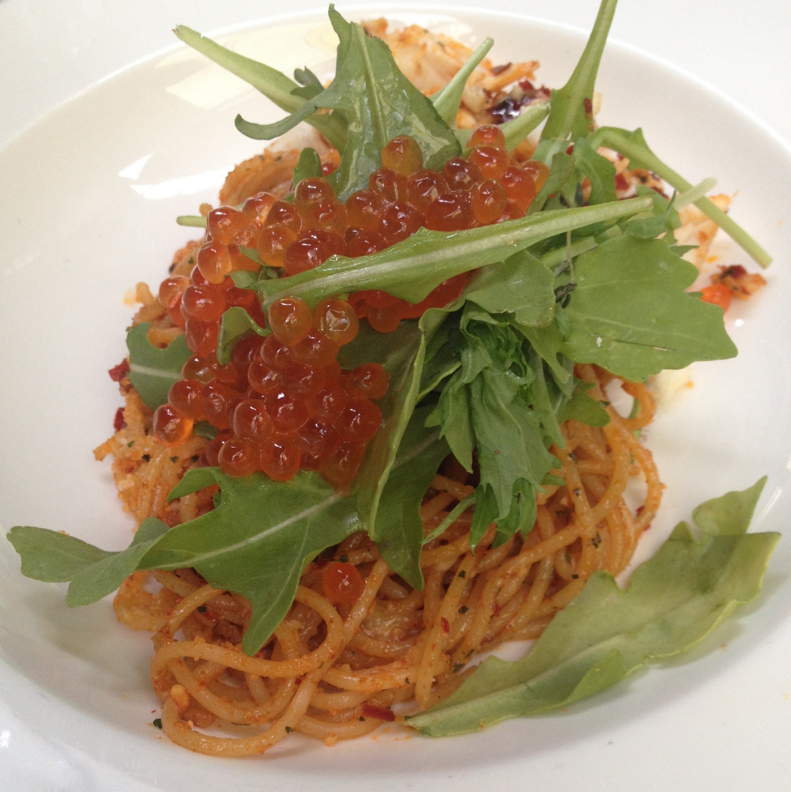 A pasta dish featuring capellini with cod roe and garlic. This was a nice dish, pleasantly salty from the roe. There was also a very spicy crab pasta (not pictured) that was enjoyable and, true to its promise, very spicy.