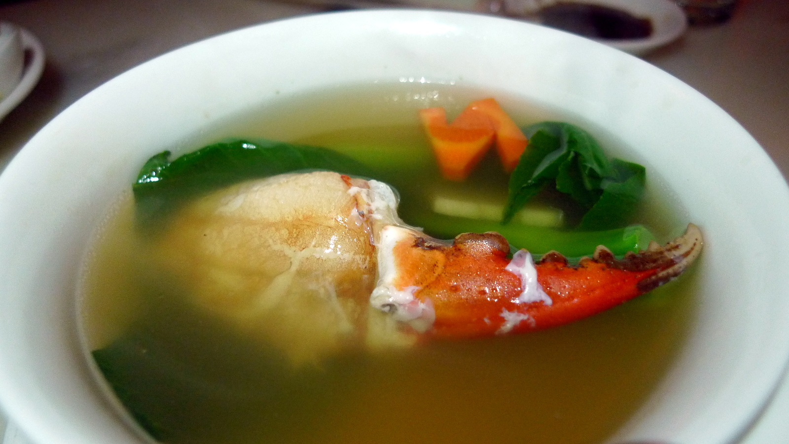 Soups are usually available per-person, that way everyone can order what they want. One of our friends had this crab claw meat (one perfect, unbroken piece) served in a lovely consommé broth with vegetables.