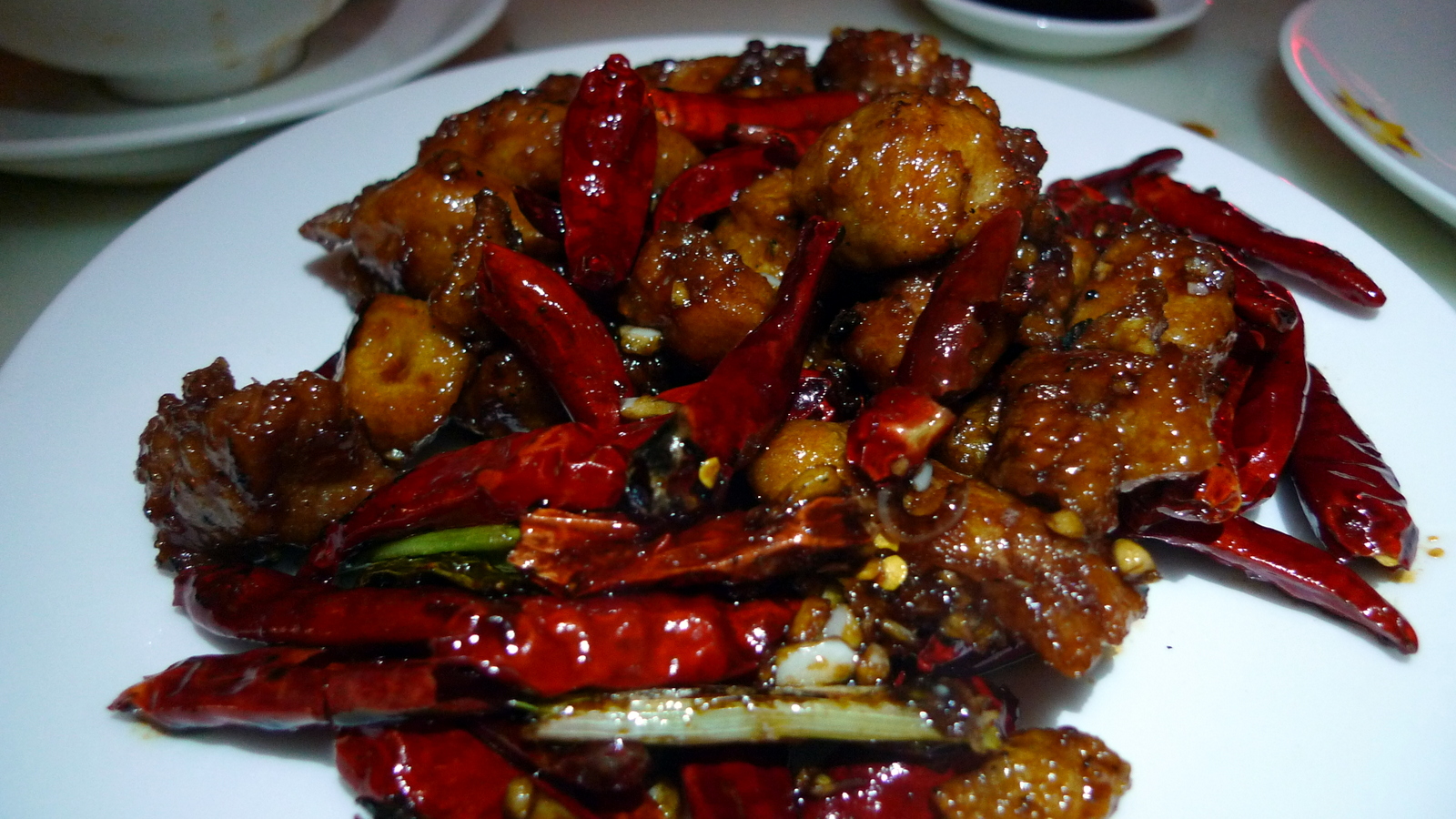 This is a Szechuan style dish: sautéed diced chicken with garlic, star anise, chilies, and spring onion. It isn’t as hot as you might imagine and was one of my favorite dishes.