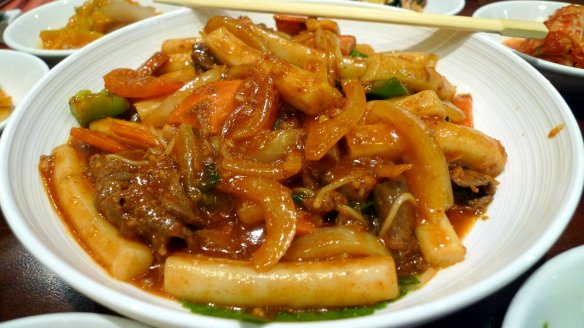 Our first dish was the jeyook bibimbab, rice and vegetables with spicy stir-fried pork. This was tasty. One of the nice things about bibimbab is the crispy crust of rice that forms at the bottom of the bowl. When it is time to eat it, there’s a nice crunchiness to it, a textural contrast to the rest of the dish.