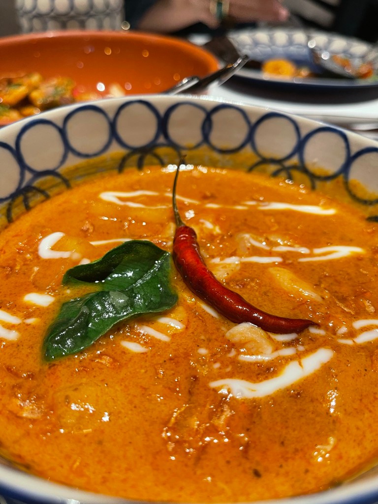 The menu is crafted by chef Vichit Mukkura whose one-star Michelin restaurant Khao is located on nearby Ekkamai Road. The presentation was pretty although several of the dishes tasted under-seasoned. The massaman curry was fantastic, though, and full of flavor. With the curfew still in place, staff took last orders at 7:30 and by 8:00 our dinner was winding down.